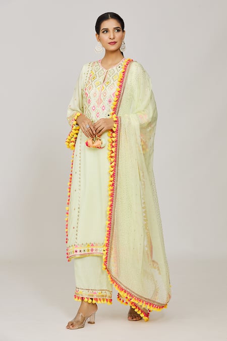 Buy_Gopi Vaid_Green Viscose, Linen, Chiffon, Satin Tassels, Embroidery Mint Kurta Palazzo Set _Online_at_Aza_Fashions