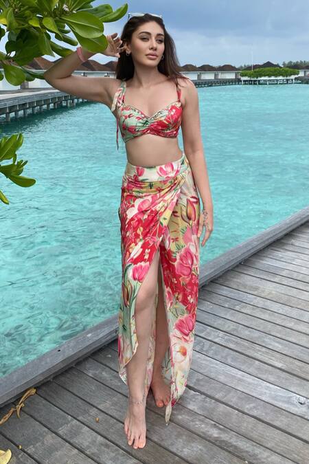 Multi-color crop top with placement gota and thread work. Paired with wrap-style draped skirt.