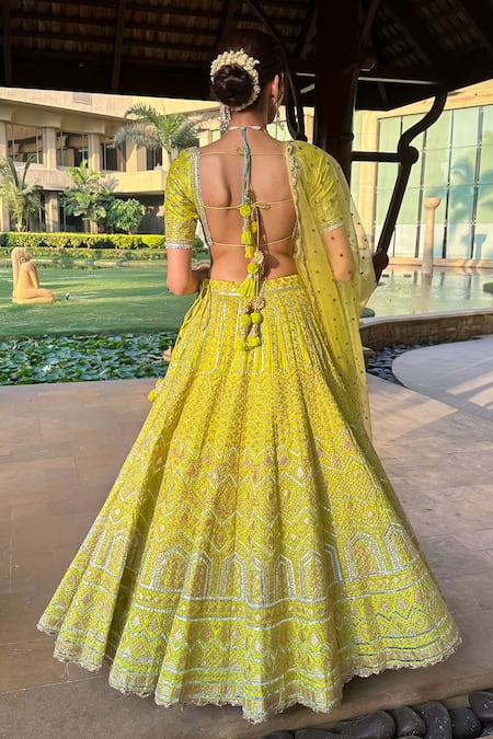 Lime green tussar silk lehenga featuring geometric and floral embroidery with attached cancan. Paired with an embroidered blouse and organza dupatta.