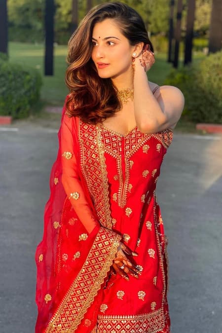 Red kurta with floral marodi embroidery, jewelled tone tussar silk & hand woven silk brocade panels. Paired with scallop hem, floral motif sharara & organza dupatta.