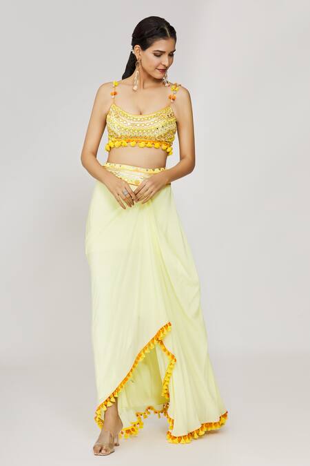 Yellow blouse featuring round neckline, sleeveless design, and intricate geometric pattern with mirror and sequin embroidery. Paired with a draped skirt showcasing fringe drop tassel details and a broad embroidered waistband.
