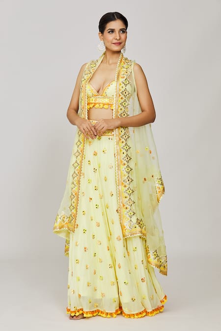 Yellow embroidered lehenga set featuring a plunging sweetheart neck blouse and an open cape. The set is adorned with mirror and sequin work, complemented by fringe drop tassel details and a scallop cut work cape hem.