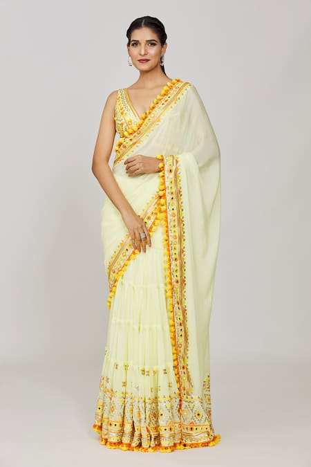 Yellow chiffon pre-draped saree featuring geometric pattern border, multi-layered tiered panels, and an attached draped pallu. Accompanied by an embroidered plunged V neck blouse with fringe drop tasselled border and deep V back.