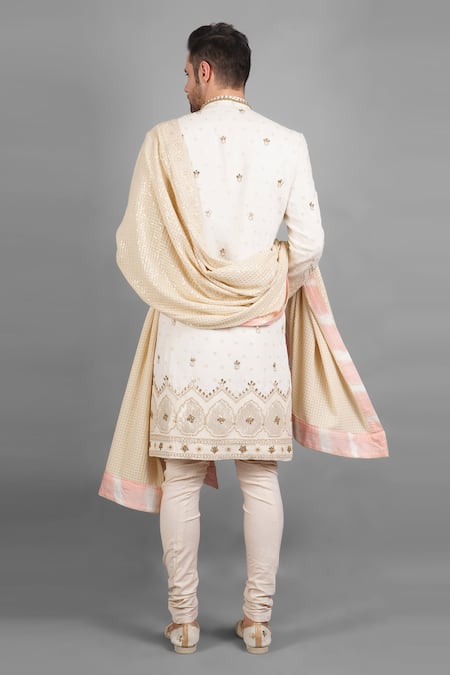 Ivory sherwani featuring gota and floral embroidery with a band collar neckline. Paired with a kurta, churidar, and a contrast stole.
