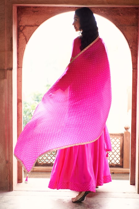Hot pink kurta featuring gota patti and dori embroidery on the yoke and sleeves. Paired with a sharara and a bandhani pattern dupatta with tassels.