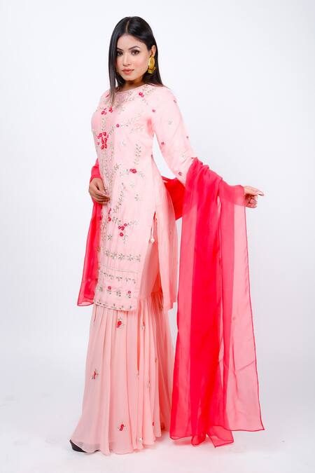 Pink kurta featuring gota patti embroidered floral motifs highlighted with sequin, cut dana, and pearls. Paired with a matching sharara and contrasting red dupatta.