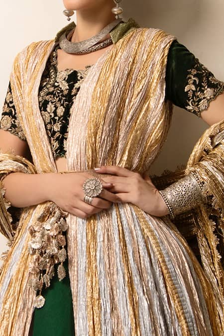 Silver, gold long jacket with crushed texture. Paired with emerald silk flared pant & embroidered crop top.