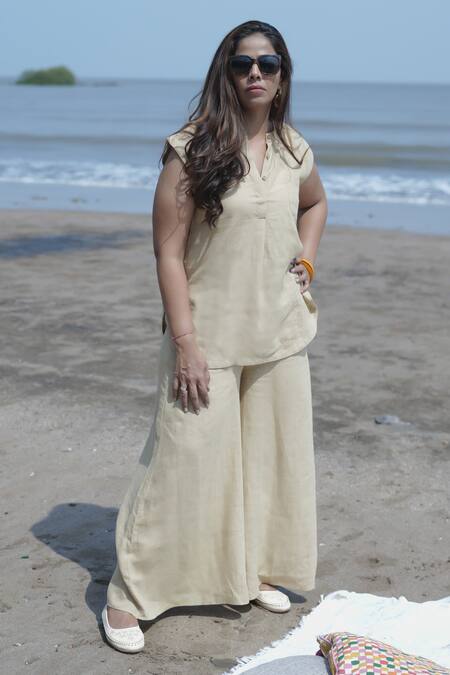 Buy_Gothilo_Brown Linen Mandarin Collar Biscoff Top And Palazzo Set