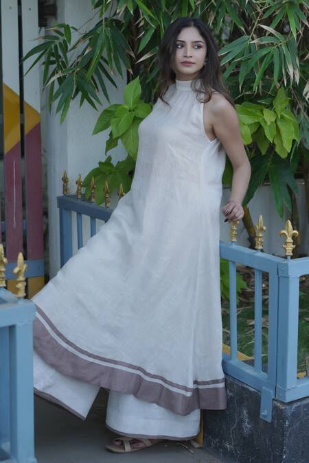 Buy_Gothilo_Beige Linen Halter Neck Natural Flared Kurta And Palazzo Set _at_Aza_Fashions