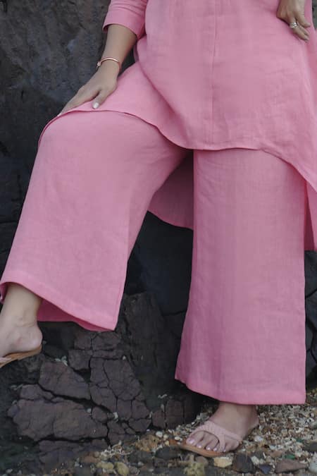 Pink Linen Collared Salmon High-low Kurta And Palazzo Set
