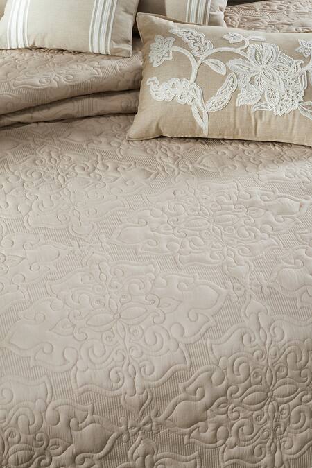 Natural bed spread in quilted pattern & floral, grapevine embroidery. Comes with pair of pillow cover, pair of cushion cover & deck cover.