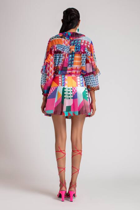 Multicolored top with geometric printed motifs, puff sleeves, frill detail & hand embellished work. Paired with inner.
