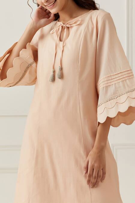 Peach chanderi kurta featuring scalloped edges and a tie-up neck. Paired with elasticated pant and a matching dupatta.