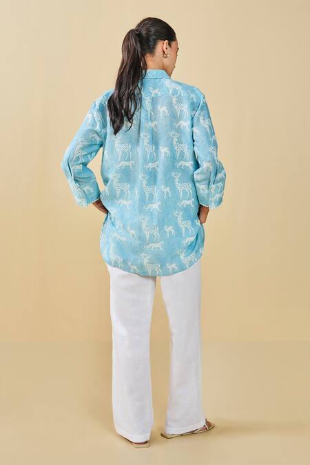 Buy_Grassroot By Anita Dongre_Blue Bamboo Embroidery Collared Chital Hand Block Printed Shirt_Online_at_Aza_Fashions