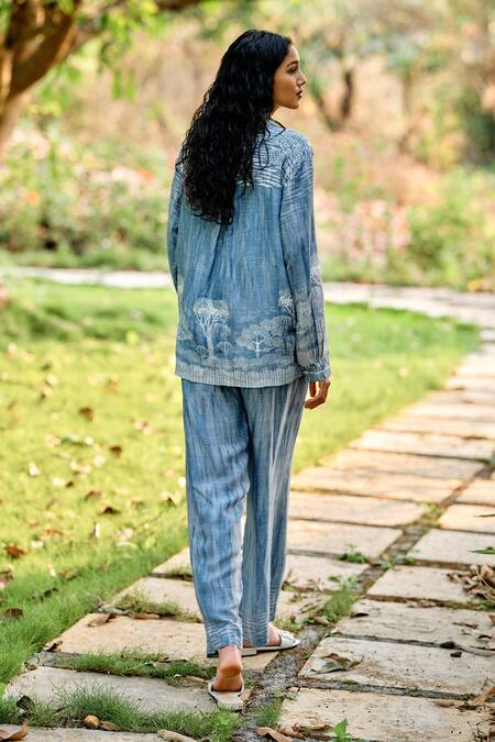 Blue top featuring abstract print with hand embroidered chikankari detailing and full sleeves. Paired with matching printed pant in a relaxed fit.