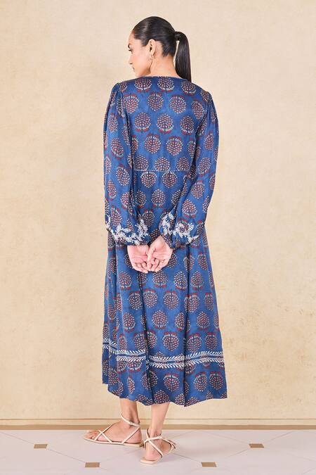 Blue Viscose, Modal Embroidery Round Neck Floral Ajrakh Print Midi Dress