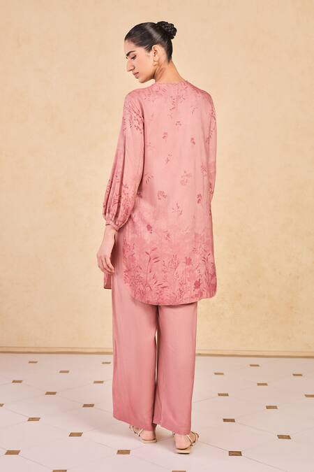 Pink kurta featuring floral print, round neckline, and front button closure. Paired with matching pant with side pockets.
