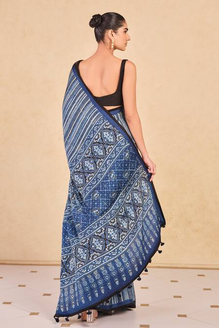 Blue saree featuring a geometric and stripe print throughout. Accompanied by an unstitched blouse piece for customization.
