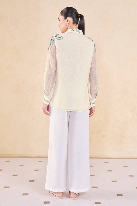 Ivory Cotton, Silk, Viscose Embroidery Collared Thread Shirt