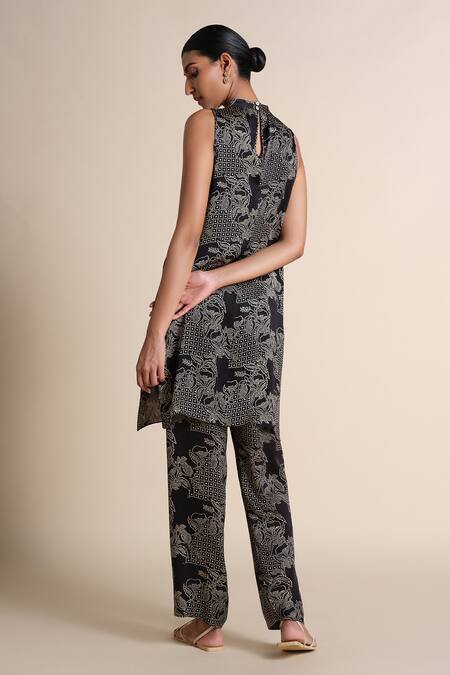 Black straight kurta featuring intricate printed design and a keyhole back. Paired with matching printed pants for a coordinated look.