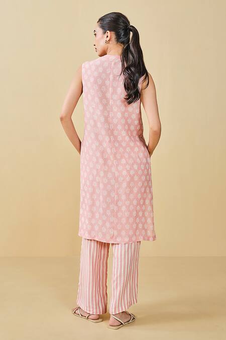 Peach kurta featuring a V neckline and sleeveless design with floral hand block print. Paired with striped pants, enhancing the overall aesthetic.