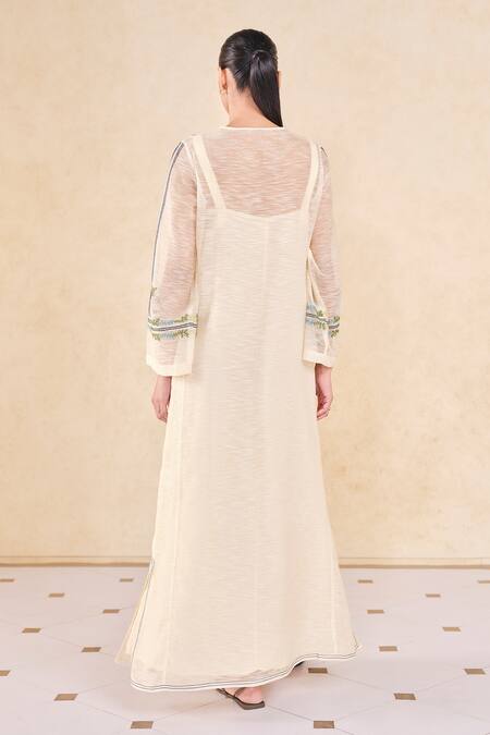 Ivory kaftan featuring thread embroidery in floral patterns and a keyhole neckline. Paired with a slip dress underneath.