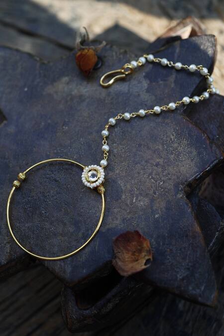 Gold plated nose ring with kundan embellished motif and pearl strand.
