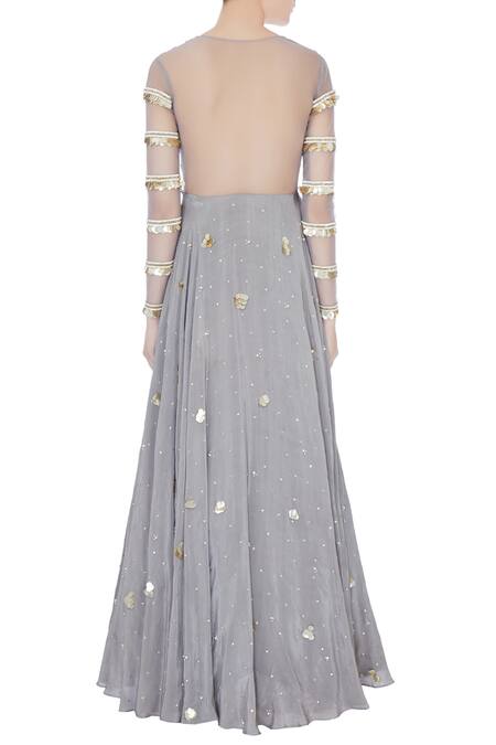 Grey anarkali with 3D floral motifs & sequin work. Comes with embellished dupatta.