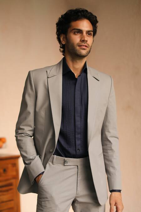 Grey cotton self textured blazer with an overlap lapel. Paired with cotton pant.