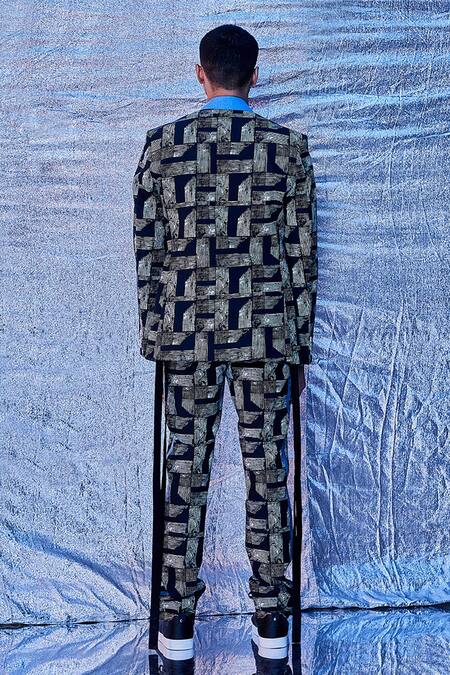 Black tuxedo style jacket featuring grunge print with a highlighted blue lapel collar and flap pocket. Paired with matching pants in cotton poplin fabric.