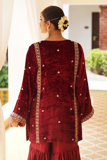 Buy_Gul By Aishwarya_Maroon Kurta Silk Velvet Embroidered Aari And Kundan Gharara Set