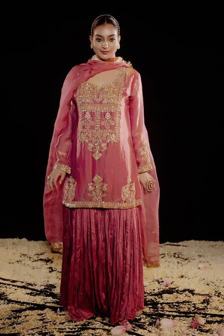 Pink Satin, Silk, Tissue, Organza Embroidery, Damask Fleur Kurta Gharara Set