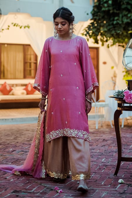 Pink kurta with zardozi & pearl embroidered floral motifs. Paired with palazzo & dupatta.