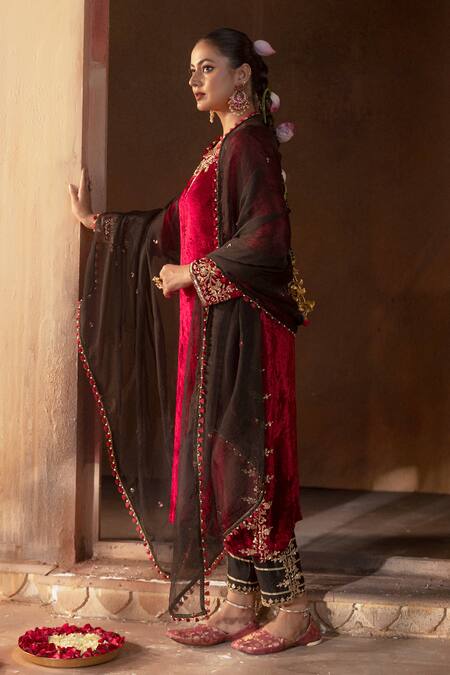 Maroon full sleeves A-line velvet kurta featuring phool minaar embroidery with zardozi and aari highlights. Paired with a satin silk embroidered black pant and pure silk organza embroidered dupatta.
