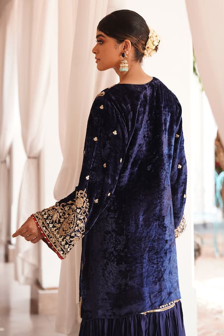 Navy blue kurta featuring flared sleeves, notched neckline, and intricate zardosi, aari, and kundan embroidery. Paired with a satin silk gharara and a georgette banarasi dupatta.