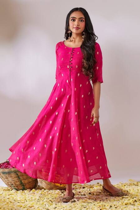 Pink anarkali featuring a banarasi brocade base with metal buttons on the placket