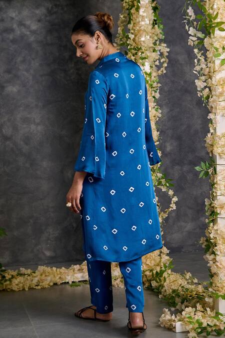 Blue kurta featuring all over tie-dye bandhani patterns in A Line silhouette. Paired with matching pants with an elasticated waistband.