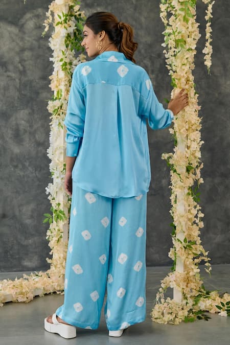 Blue shirt featuring hand tie-dyed bandhani placement print with collar and full sleeves. Paired with flared straight pants that have side seam pockets.