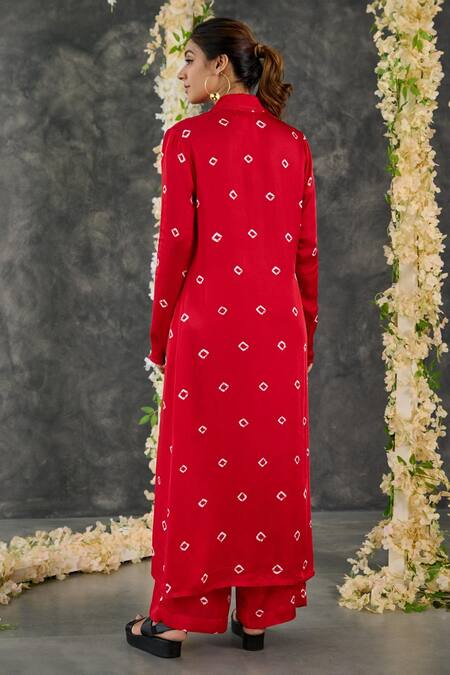 Red shrug featuring hand tie-dyed bandhani print and side seam pockets. Paired with flared straight pant, both crafted from modal satin.