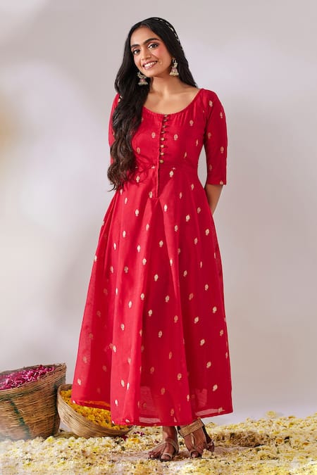 Red Anarkali featuring a banarasi brocade base with metal buttons on the placket