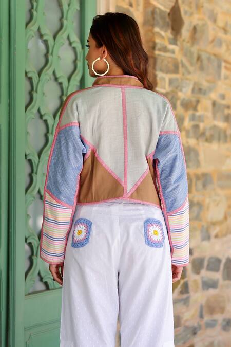 Gulaal_Multi Color , Satin Patchwork Mandarin Collar Jacket_Online_at_Aza_Fashions