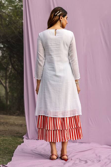 White midi dress featuring hand embroidered heart and hand printed stripe ruffles