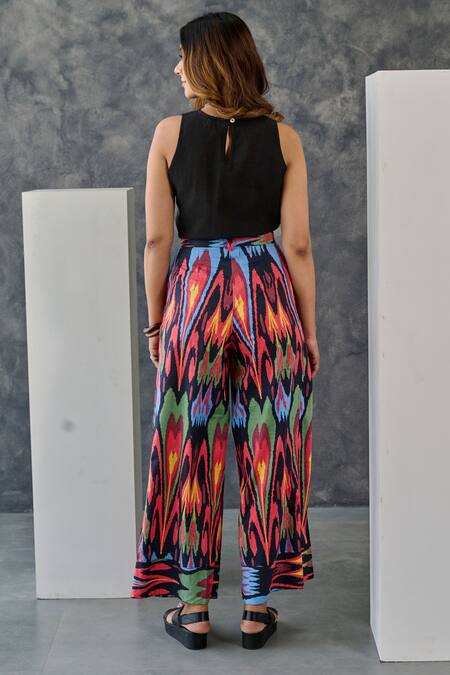 Black sleeveless top with a round neckline in cotton. Paired with a multicolored sleeveless printed blazer and printed pant featuring an abstract print design.