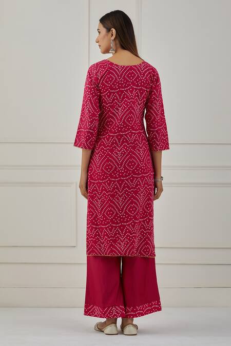 Fuchsia pink kurta featuring a bandhani print with a V neck and three-quarter sleeves. Paired with matching pant and a lace detailed dupatta.