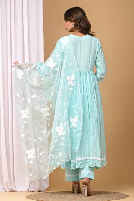 Sea green Anarkali featuring a V-neck, three-quarter sleeves, and lace embellishments. Paired with a floral embroidered dupatta and coordinating pant.