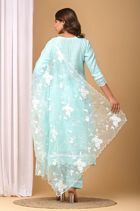 Sea green kurta featuring a notched neckline, three quarter sleeves, and lace embellishments. Paired with coordinating straight pant and floral embroidered dupatta.