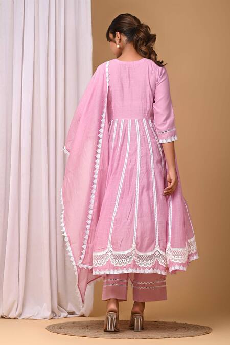 Purple Handloom Cotton, Chanderi Lace Round Neck Kalidaar Anarkali And Pant Set