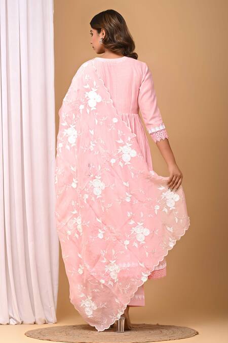 Pink Chanderi, Chiffon Embroidery, Lace V-neck Yoke Gathered Anarkali And Pant Set