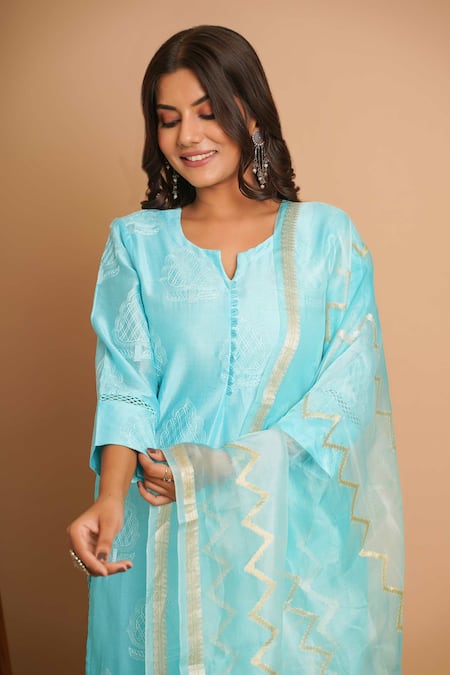 Blue A-line kurta featuring damask embroidery with three fourth sleeves. Paired with a jaal lace hem pant and chevron pattern dupatta with tassel embellishments.