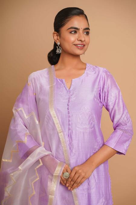 Purple Chanderi, Handloom Cotton Embroidery, Lace, Damask Fleur Kurta Pant Set
